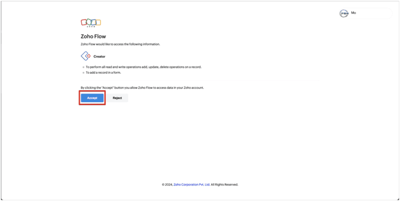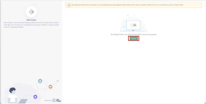 Click "Connect" for ZOHO Flow access.