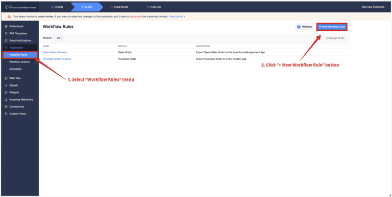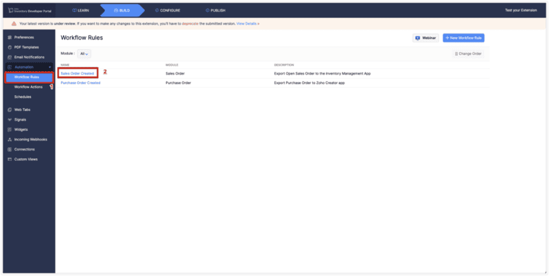 Now that the connection between ZOHO Inventory and ZOHO Creator is established, next step is to create an automation rule.