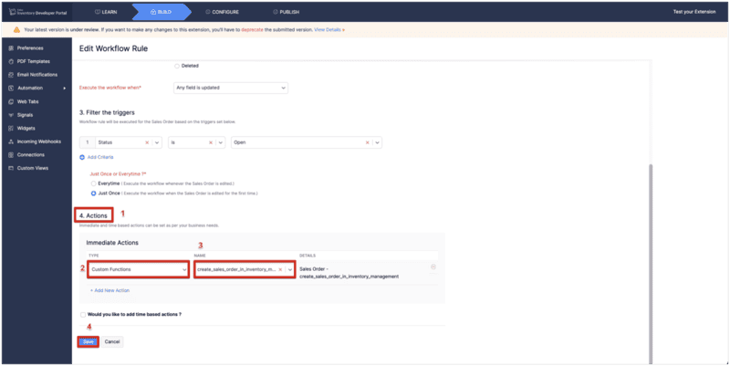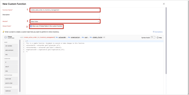 - Select the custom function, "create_sales_order_in_inventory_management", you just created for the sales order module.