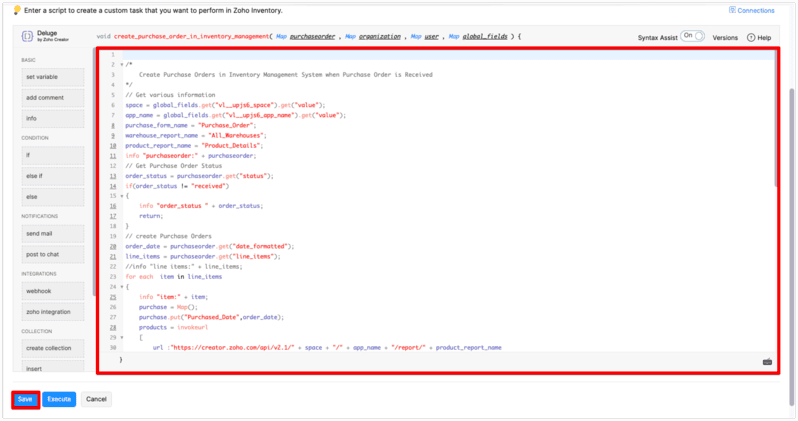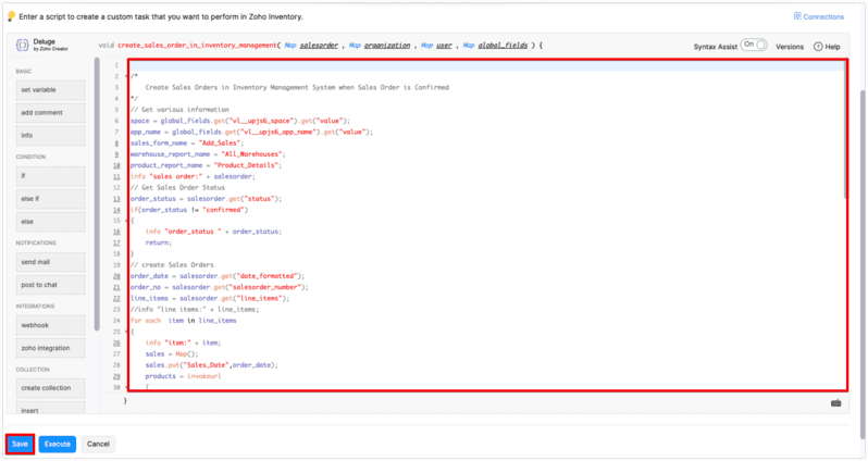Refer to the below sample code to write deluge scripts in the editor and click "Save" button.