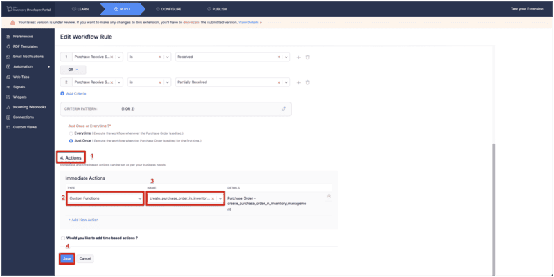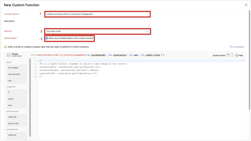 - Select the custom function, "create_purchase_order_in_inventory_management", you just created for the sales order module.