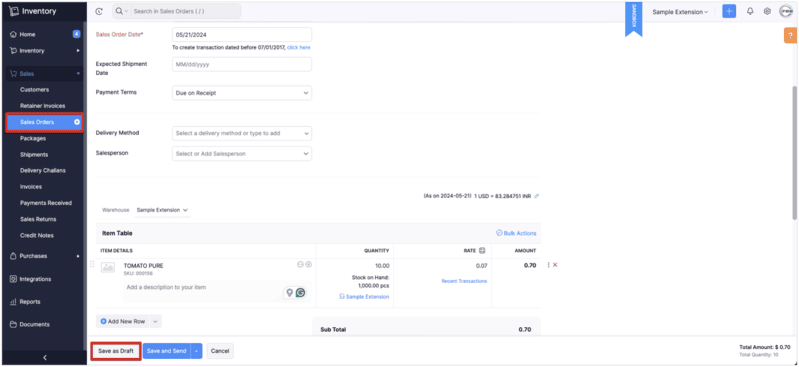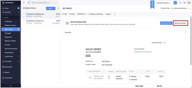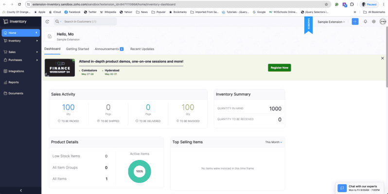 - The sandbox ZOHO Inventory app opens in the separate window.