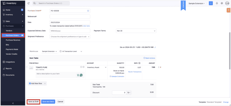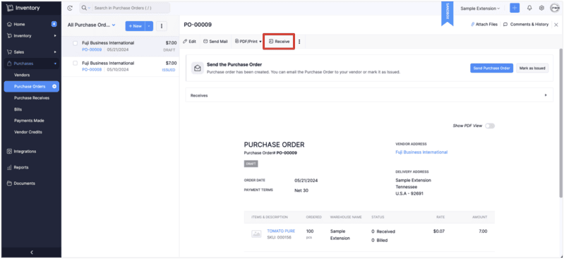 - Confirm new purchase order is created in Purchase Details module.